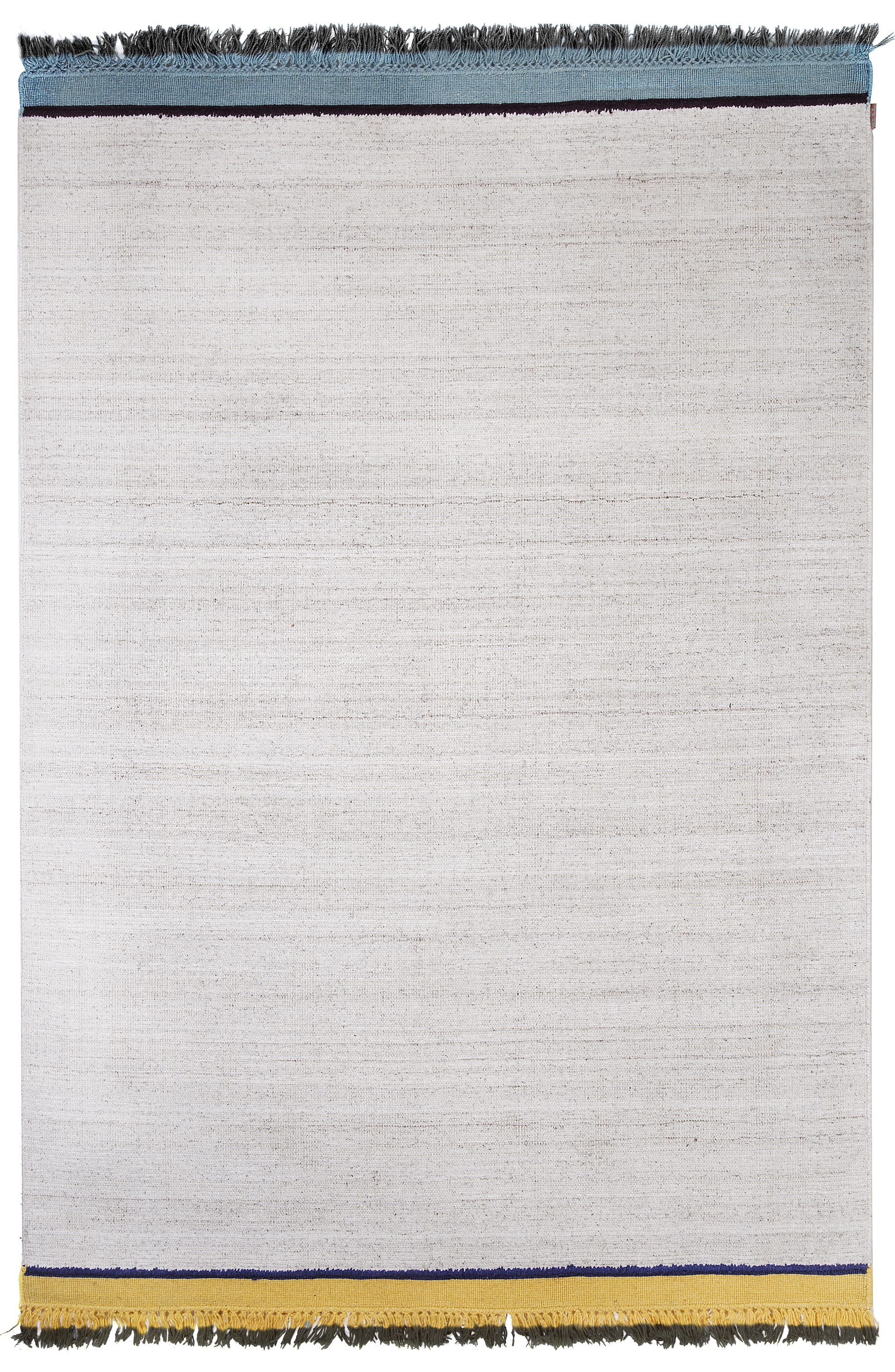 Elemental is an essential rug, basic yet deeply resonant, that speaks to humanity's fundamental desires for texture and color. Powerful and primal, Elemental is attuned to and composed of the classical elements: air, earth, fire, and water. It is crafted using a 'handloom' weaving technique with a wool and viscose blend, featuring colored borders in two distinct shades. The fringes are finished with a vibrant 'dip dye' technique.